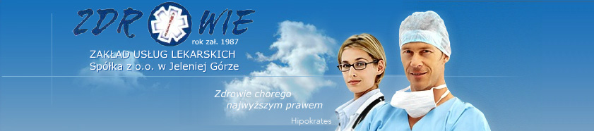 Zakład Usług Lekarskich ZDROWIE sp. z o.o. jest Niepublicznym Zakładem Opieki Zdrowotnej, działającym na terenie Jeleniej Góry od 1987 r. Celem naszej działalności jest prowadzenie profilaktyki zdrowotnej poprzez pomoc w chorobie i cierpieniu Pacjentów, z uwzględnieniem przestrzegania praw pacjenta oraz stosowaniu właściwych metod diagnostycznych i leczniczych zgodnie z obowiązującymi standardami.
